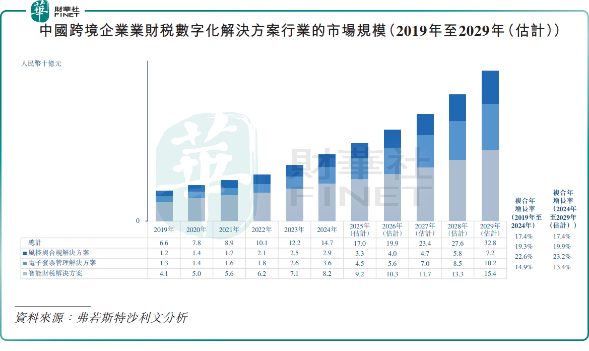 数据显示,中国跨境企业业财税数字化解决方案行业的特点是市场规模不大但增长迅速,2024年市场规模仅为147亿元(单位人民币,下同),预计到2029年市场规模达到328亿元。