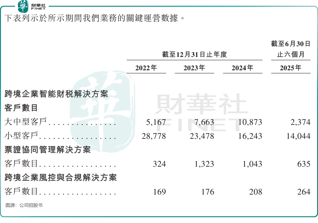 在客户数量下降的同时,结构也出现明显变化。2024年,跨境企业智能财税解决方案的中大型客户数量突破1万家,反映公司向中大型客户倾斜的战略,但同期小型客户数从2022年的2.88万家降至2024年的1.62万家,票证协同管理解决方案的客户数在2024年也有所回落。