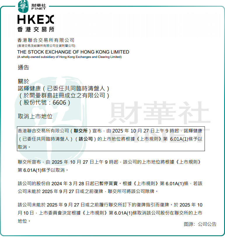 这四家企业分别为诺辉健康(06606.HK)、浦江国际(02060.HK)、上坤地产(06900.HK)和建中建设(00589.HK)。根据公告,港交所将于10月27日上午9时起,正式取消上述公司的上市地位。