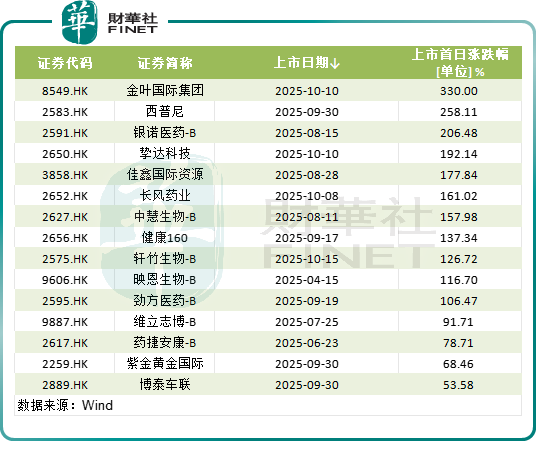 此外,上市首日破发个股数量大幅减少。在76只新股中,仅17只首日出现破发,破发率为22.4%,去年全年这一占比为34.3%。而首日涨幅惊人的个股不在少数,有11只股票涨幅超一倍,金叶国际集团(08549.HK)更是飙升330%。