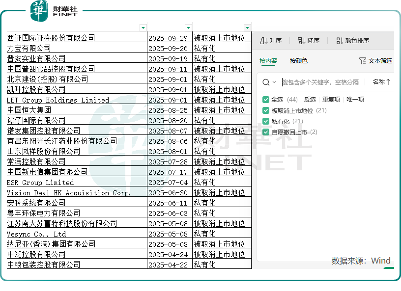 在今年前9月退市的44家企业中,有21家企业是被港交所取消上市地位,与私有化退市的企业数量相当,自愿撤回上市的企业则有2家。