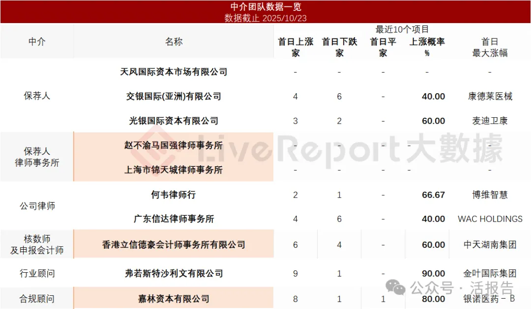 据LiveReport大数据统计,协创数据中介团队共计10家,其中保荐人3家,近10家保荐项目数据整体表现不尽如意;公司律师共计2家,综合项目数据整体不足。整体而言中介团队历史数据表现不足。