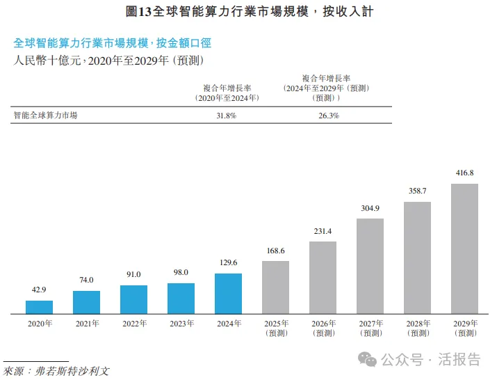 全球智能算力市场规模从2020年的人民币429亿元增长至2024年的人民币1,296.0亿元,复合年增长率约为31.8%。预计到2029年,全球智能算力市场规模将达到人民币4,168亿元,2024年至2029年的复合年增长率约为26.3%。