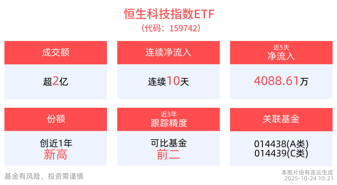 流动性方面,恒生科技指数ETF盘中换手4.89%,成交2.25亿元。拉长时间看,截至10月23日,恒生科技指数ETF近1月日均成交7.10亿元。