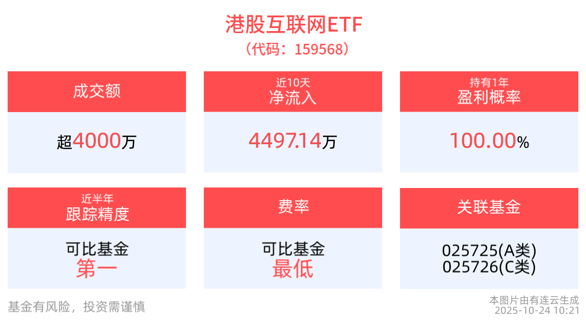 流动性方面,港股互联网ETF盘中换手12.47%,成交4941.87万元,市场交投活跃。拉长时间看,截至10月23日,港股互联网ETF近1年日均成交2.17亿元。