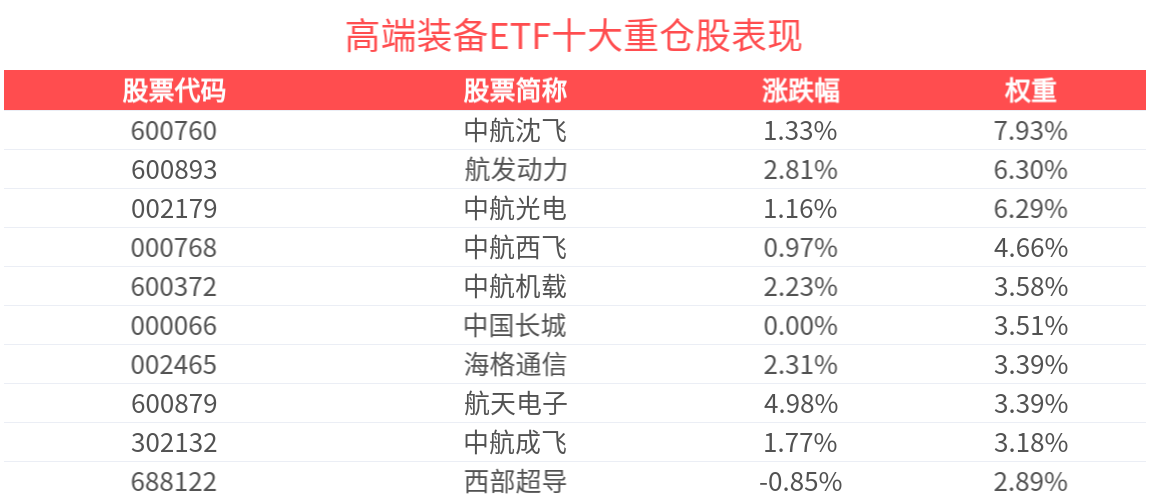 数据显示,截至2025年9月30日,中证高端装备细分50指数前十大权重股分别为中航沈飞、航发动力、中航光电、中航西飞、中国长城、菲利华、航天电子、中航机载、西部超导、中航成飞,前十大权重股合计占比46.85%。