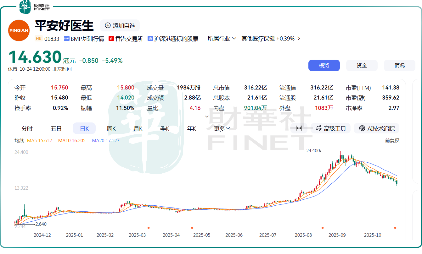 值得玩味的是资本市场的反映。10月24日,平安好医生(01833.HK)股价继续下行,一度下探9.4%,截至发稿前,该股跌幅为5.49%,报14.63港元/股。