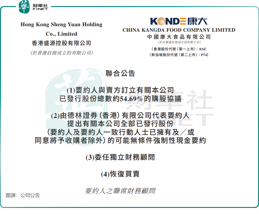 紧随其后,国内知名食品制造企业——康大食品(00834.HK)于10月24日发布要约收购公告。不过,康大食品本次仅为股权转让,并不涉及私有化退市安排。