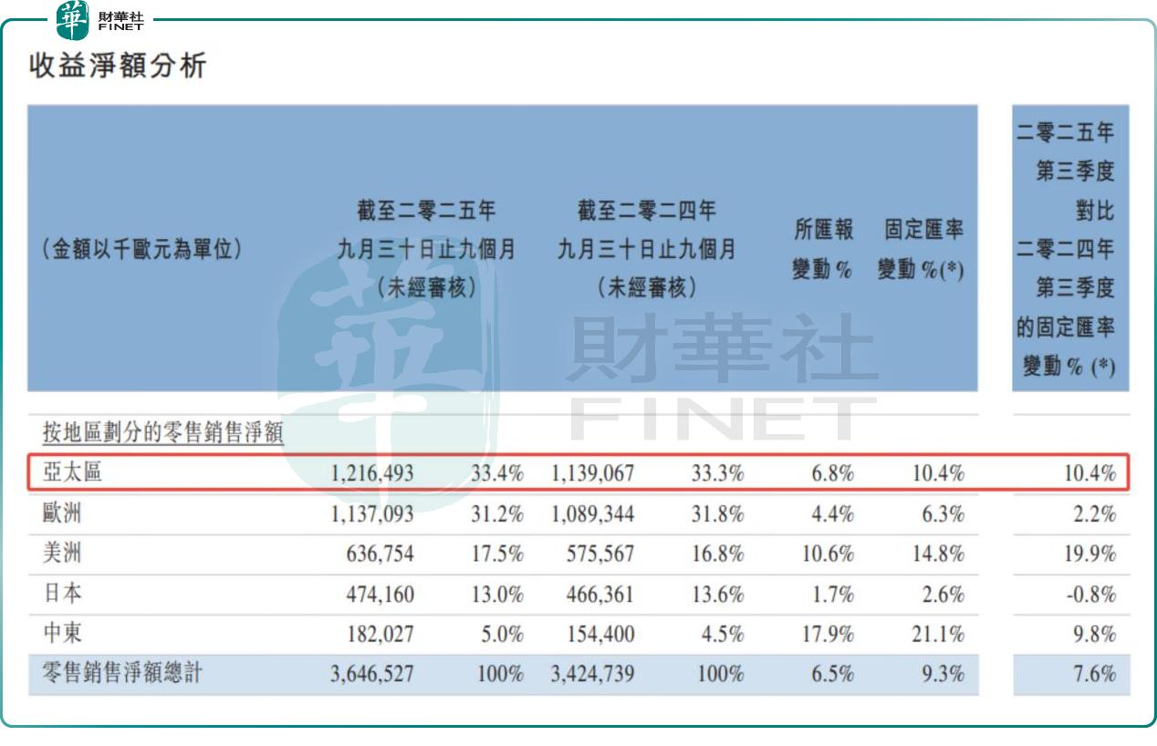 其中,亚太区零售净额同比增长10.4%。中国内地市场趋势改善,对亚太区整体增长起到关键作用。