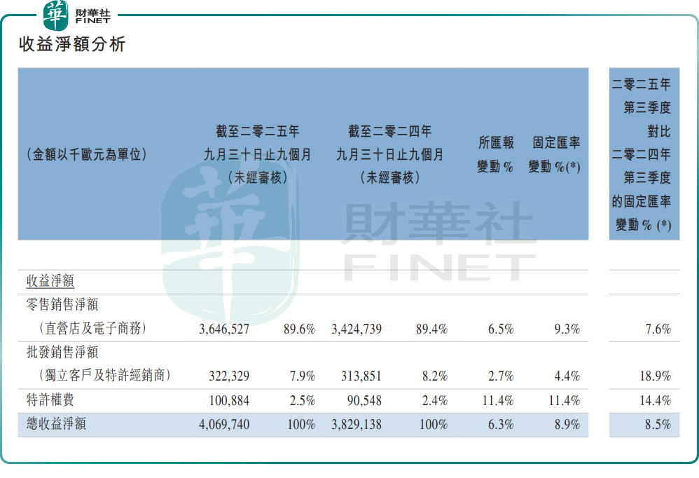 报告期内,零售销售净额(直营店及电子商务)稳健提升,同比增长9.3%,占总收益净额的89.6%。