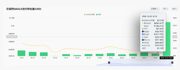 PANews 10月25日消息,Coinglass数据显示,全网GIGGLE合约总持仓量已达到51.50万枚,持仓规模突破1亿美元,现报1.10亿美元,创下历史新高,24小时涨幅254.35%,其中币安的GIGGLE合约持仓30.39万枚(6561.61万美元),24小时涨幅265.76%;Bybit的GIGGLE合约持仓6.05万枚(1306.61万美元),24小时涨幅209.04%。