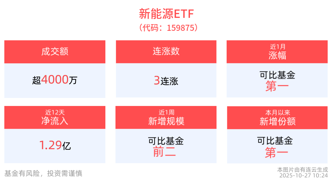 截至10月24日,新能源ETF近6月净值上涨57.63%,指数股票型基金排名400/3780,居于前10.58%。从收益能力看,截至2025年10月24日,新能源ETF自成立以来,最高单月回报为25.07%,最长连涨月数为5个月,最长连涨涨幅为62.44%,上涨月份平均收益率为8.85%。