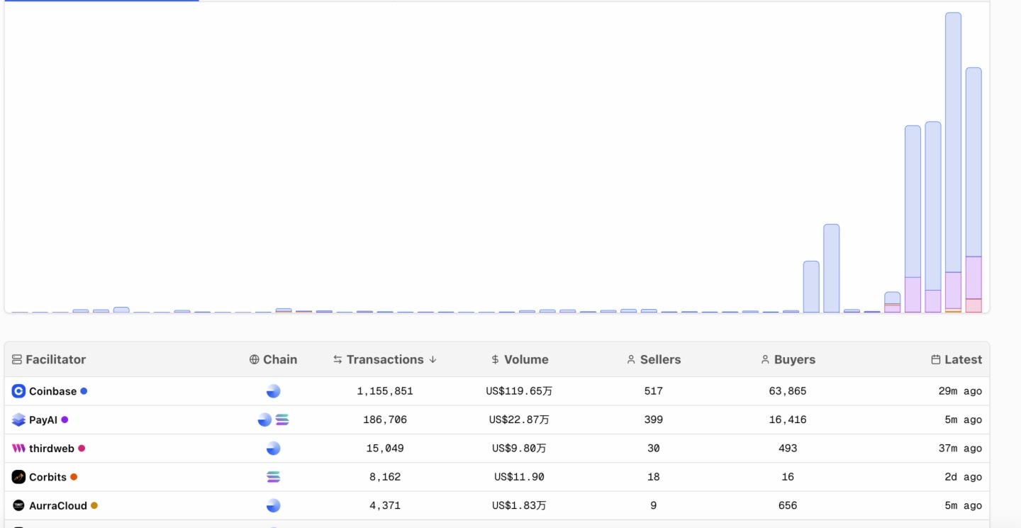 从交易执行主体来看,Dune数据显示,交易活动高度集中在少数核心Facilitator手中。其中,Coinbase Facilitator(Base)为第一大“代付管家”,累积处理交易量超100.4万美元,交易笔数超116万笔;第二大Facilitator PayAI(Base和Solana)累积处理交易量超21.9万美元,交易笔数超17.5万笔;其余 Facilitator 处理规模均较小。