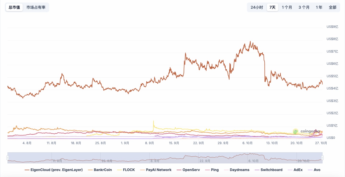 从市场规模看,EigenCloud是最主要的市值支撑,达到约4.5亿美元,虽然该项目在今年10月通过集成x402支付标准实现稳定币即时支付功能,但其市值增长并非主要受x402生态推动;市值在千万美元级别的中型项目仅有9个,包括Bankr、PAYAI、OpenServ、PING等;其余约75%的项目市值均在数百万甚至几十万美元级别,呈现出高度分化的市场结构。