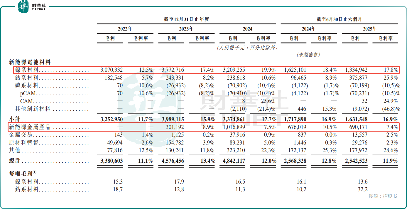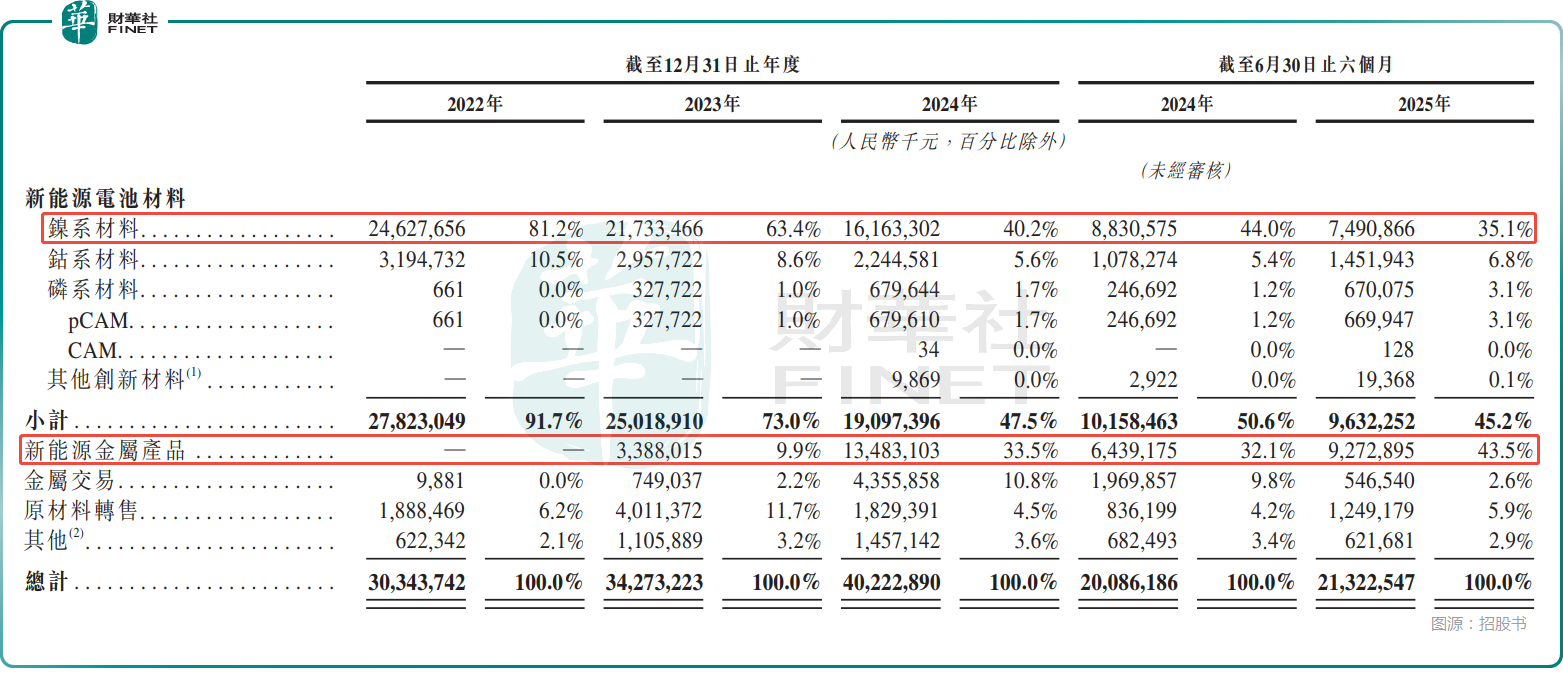 分产品来看收入结构,2022年至2024年及2025年上半年,镍系材料的收入占总收入的比重分别为81.2%、63.4%、40.2%、35.1%,处于持续下降状态;而新能源金属产品的收入占比分别为0、9.9%、33.5%、43.5%,增势迅猛。