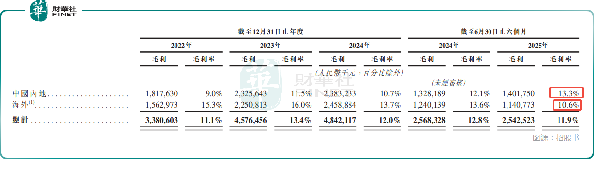 不过,在2025年上半年,中国内地市场的毛利率增至13.3%,而海外市场的毛利率下降至10.6%。