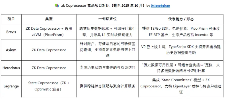 当前 zk-Coprocessor 赛道已形成以 Brevis、Axiom、Herodotus、Lagrange 为代表的格局。 其中 Brevis 以「ZK 数据协处理器 + 通用 zkVM」融合架构领先,兼具历史数据读取、可编程计算与 L1 RTP 能力;Axiom 聚焦可验证查询与电路回调;Herodotus 专注历史状态访问;Lagrange 以 ZK+Optimistic 混合架构优化跨链计算性能。 整体来看,zk-Coprocessor 正以「可验证服务层」的方式成为连接 DeFi、RWA、AI、身份 等应用的可信计算接口。
