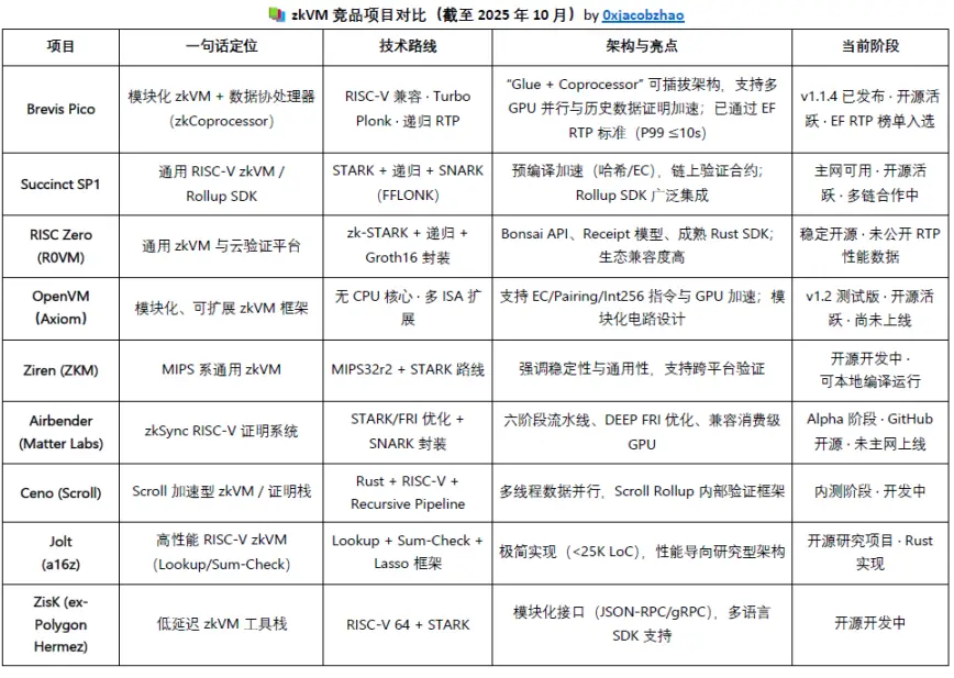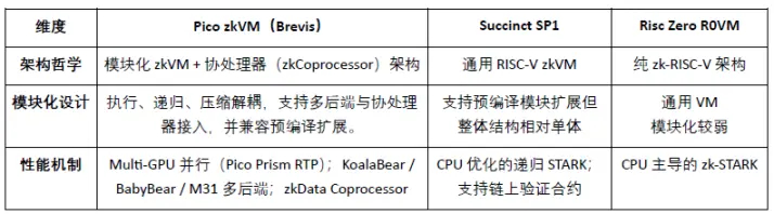 相较于 Succinct SP1 的相对单体化 RISC-V zkVM 架构和 RISC Zero R0VM 的通用 RISC-V 执行模型,Pico 通过 Modular zkVM + Coprocessor System 实现执行、递归与压缩阶段的解耦与扩展,支持多后端切换及协处理器集成,在性能与可扩展性上形成差异化优势。