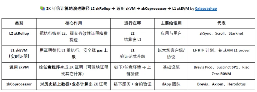 而在以太坊生态之外,零知识证明(ZKP)技术也延伸至更广泛的 通用可验证计算(Verifiable Computing) 领域,形成以 zkVM 与 zkCoprocessor 为核心的两类技术体系。