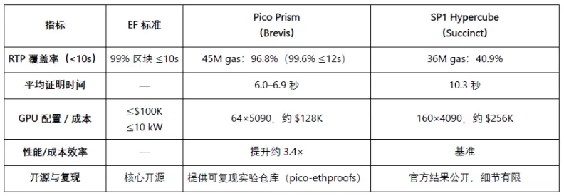在 64×RTX 5090 GPU(约 $128K) 配置下,Pico Prism 在 45M gas 区块中实现 平均延迟 6.9 秒、96.8% <10s、99.6% <12s 的性能表现,显著优于 Succinct SP1 Hypercube(36M gas,均时 10.3s,40.9% <10s)。在延迟降低 71%、硬件成本减半的条件下,整体性能 / 成本效率提升约 3.4×。该成果已获以太坊基金会、Vitalik Buterin 与 Justin Drake 的公开认可。