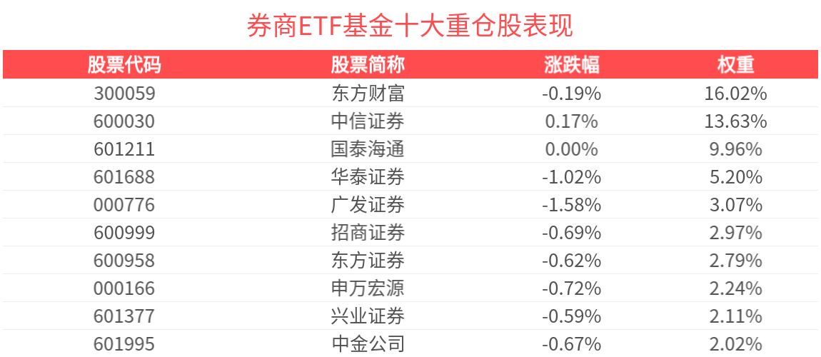 数据显示,截至2025年9月30日,中证全指证券公司指数(399975)前十大权重股分别为东方财富(300059)、中信证券(600030)、国泰海通(601211)、华泰证券(601688)、广发证券(000776)、招商证券(600999)、东方证券(600958)、申万宏源(000166)、兴业证券(601377)、中金公司(601995),前十大权重股合计占比60.1%。
