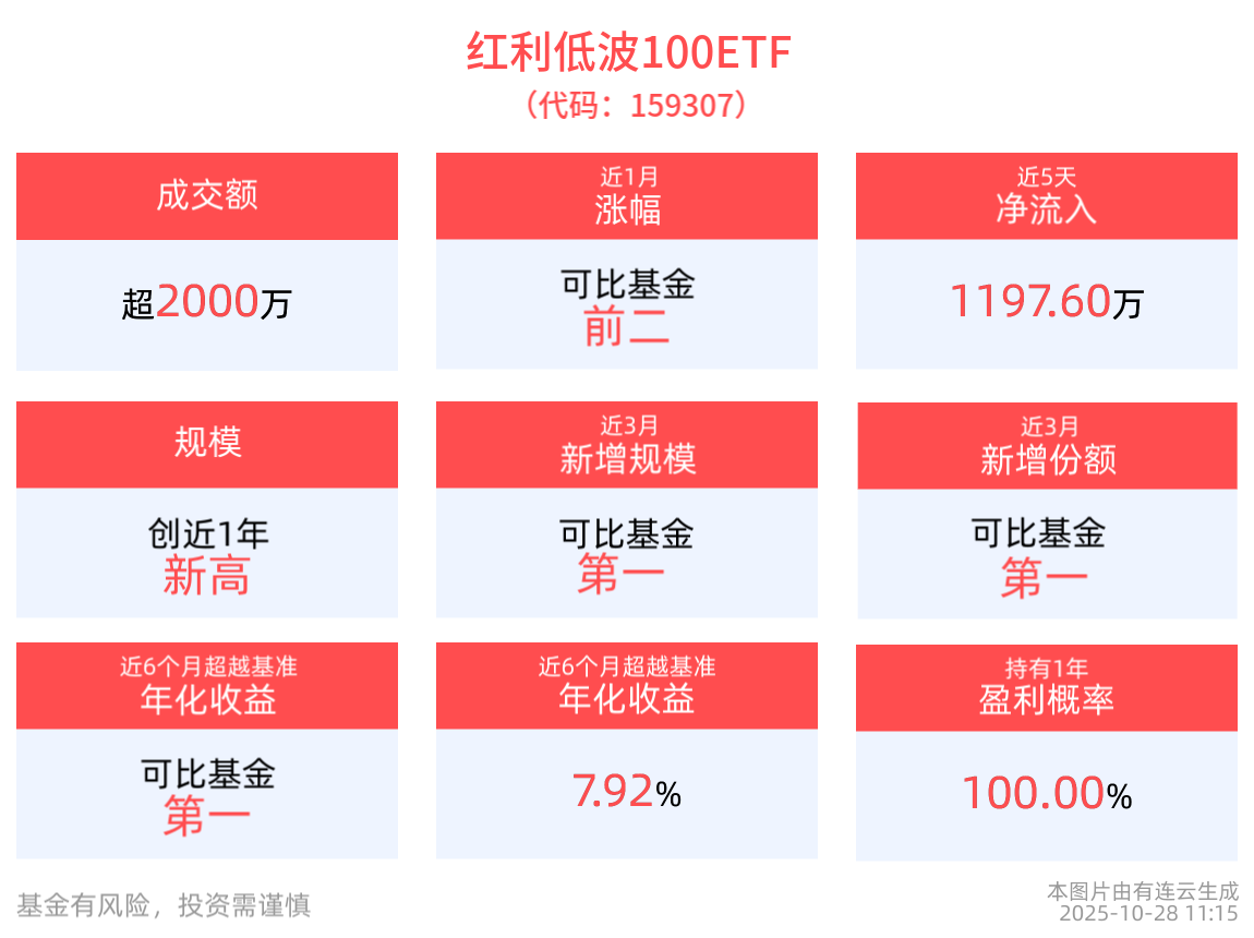 流动性方面,红利低波100ETF盘中换手1.54%,成交2249.04万元。拉长时间看,截至10月27日,红利低波100ETF近1月日均成交2225.76万元,居可比基金前2。