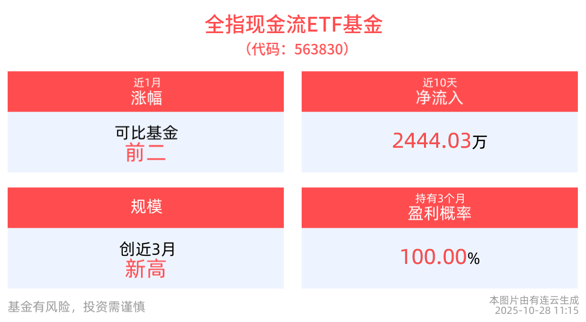 流动性方面,全指现金流ETF基金盘中换手2.07%,成交339.33万元。拉长时间看,截至10月27日,全指现金流ETF基金近1月日均成交687.67万元。