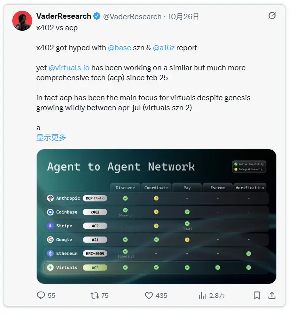 近期,x402协议成为市场热议焦点。以下将通过对比分析展示ACP协议的优势,并阐释Virtuals平台如何在这场智能体能力浪潮中占据有利位置:
