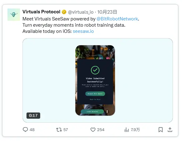 只要奖励机制与用户贡献度匹配,SeeSaw平台便能快速扩展规模,为Virtuals构建起海量的视觉交互数据库,可向所有机器人研发团队提供服务化输出。