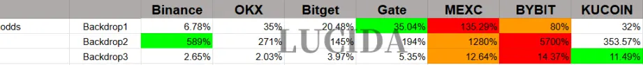 从数据中可以明显看到,在三个观察周期中,MEXC和Bybit的赔率表现稳居第一梯队。换句话说,在这里,你更有机会用更少的「试错成本」,捕捉到那些一飞冲天的标的。