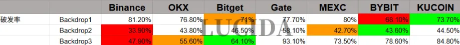 结果显示,Binance在控制破发率上展现了老大哥的稳健,通常保持最低。Bitget 与 Bybit同样表现可靠。而 Gate 在三次评比中均未进入前三,需要打新的你多一份警惕。