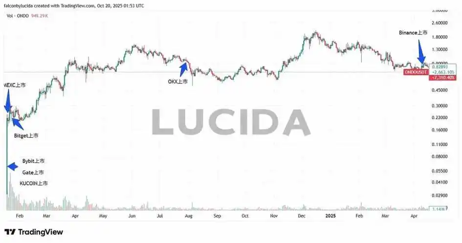 首发于 MEXC 和 Binance,下跌后开启长牛。Gate 上线在阶段性高点,Bitget 上线于低位平台后迎来上涨,KuCoin 上线后即回调,而 Bybit 和 OKX 则在新一轮行情爆发前精准布局。