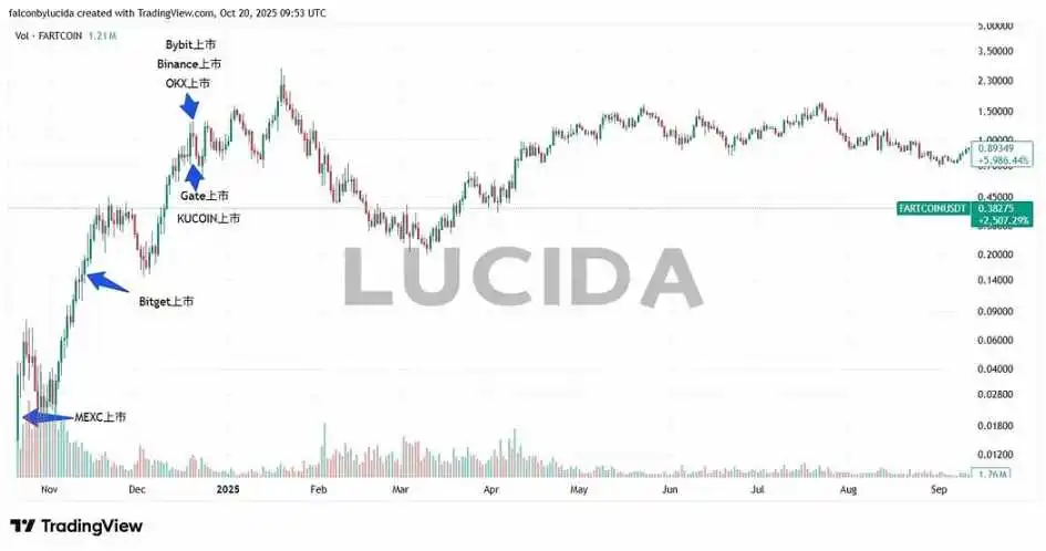 以 PEPE、POPCAT、FARTCOIN 为代表,Meme 币的生命周期极短,上市速度直接决定收益。MEXC 和 Gate 持续扮演「Meme 首发站」角色,几乎包揽了所有早期明星 Meme 币的首发。OKX 和 Binance 虽然上市较晚,但凭借庞大的用户基础,仍能推动币价进入第二波主升浪。