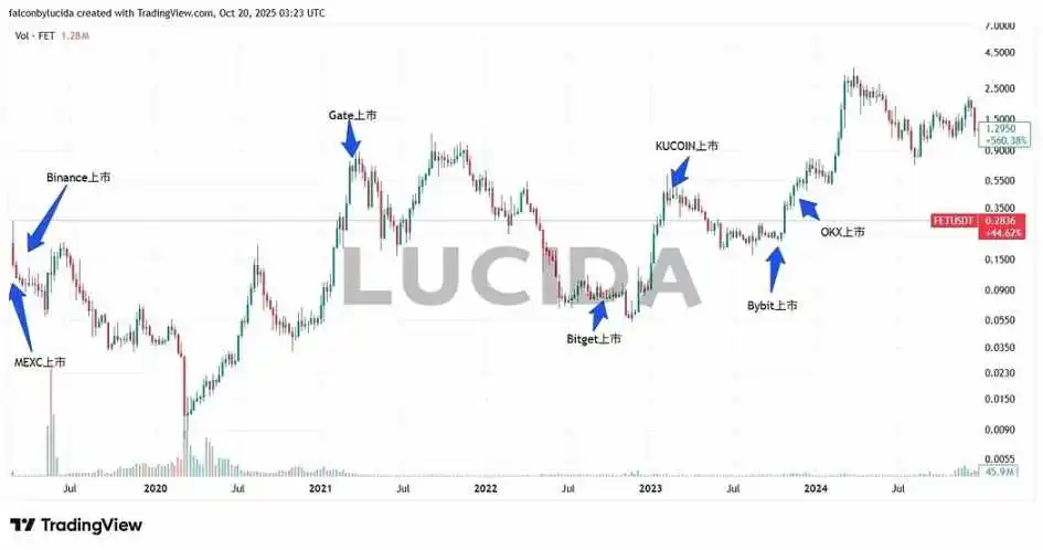 AI 与基础设施项目的技术门槛高,价值释放周期长,各交易所呈现出清晰的「梯度上币」特征。Binance 是 AI 项目(如 FET)的首选首发地,其 Alpha 平台和 IDO 渠道对 AI 赛道有明显的偏好。Bitget 和 Bybit 善于在项目经历首次调整后的低位平台期上线,为错过首发的投资者提供二次上车机会。