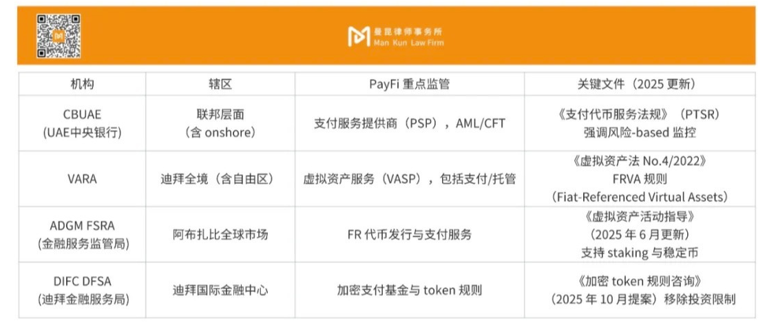 对比2024年,UAE从“加密天堂”升级为“PayFi实验室”,但别高兴太早。UAE有着“联邦+酋长国+自由区”三层合规架构,PayFi业务可能同时触及CBUAE的支付法和VARA的虚拟资产规则。稍有不慎,将同时面临不同监管机构的“多重惊喜”。