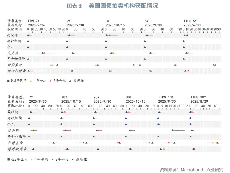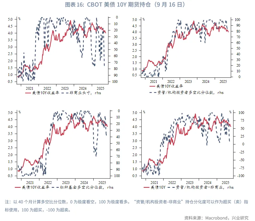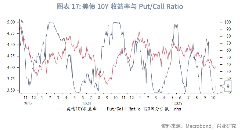 机构行为方面:因美国政府关门,美国财政部TIC报告、CBOT期货持仓报告暂停公布。EPFR全球基金流向显示10月投资者仍然更加偏好中短期限,不过月末资金流出短期限。日本投资者在10月中旬超量净卖出。美国一级交易商各期限的净多头略微增加。Put/Call Ratio从近半年低位反弹。总体而言,10月末市场多头氛围有降温迹象。