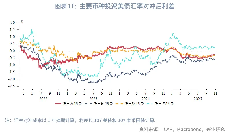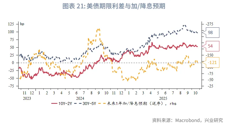 10月美国政府长时间关门,导致就业数据缺失,9月CPI数据延期发布。月中特朗普单方面升级中美贸易摩擦,同时美国两家区域银行“暴雷”,引燃避险情绪。市场保持对年内再降息50bp的高度定价,美债收益率震荡下行,10Y收益率一度迫近3.9%。不过月末中美新一轮会谈达成框架性协议,美国区域银行未进一步演变为系统性风险,9月CPI同比低于预期,均使得市场风险偏好回暖,美债收益率止跌回升。