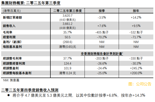 受人工智能所推动,于2025年第三季度集团的新增订单总额为4.63亿美元,连续第六个季度实现按年增长。若不包括因一间领先高密度基板制造商由于消化现有产能的速度慢于其预期,而于2025年第三季度取消了其面板沉积设备个別订单之影响,该季度的新增订单总额将为4.87亿美元,按季增长1.5%,按年亦增长20.1%。