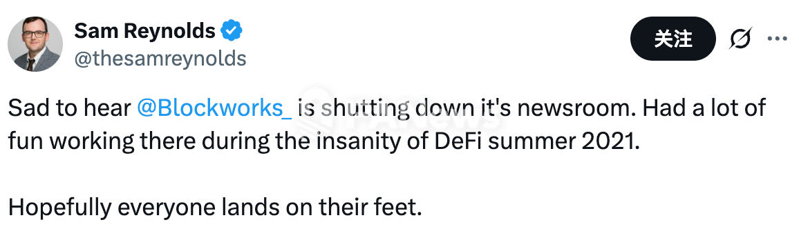 PANews 10月29日消息,据前Blockworks记者Sam Reynolds在X平台透露,加密媒体Blockworks已决定关闭其新闻编辑部。目前Blockworks官方尚未发表正式公告。