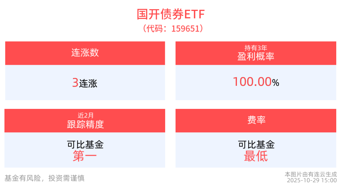 截至2025年10月29日 15:00,国开债券ETF(159651)上涨0.04%, 实现3连涨。最新价报106.56元。拉长时间看,截至2025年10月29日,国开债券ETF近1年累计上涨1.63%。