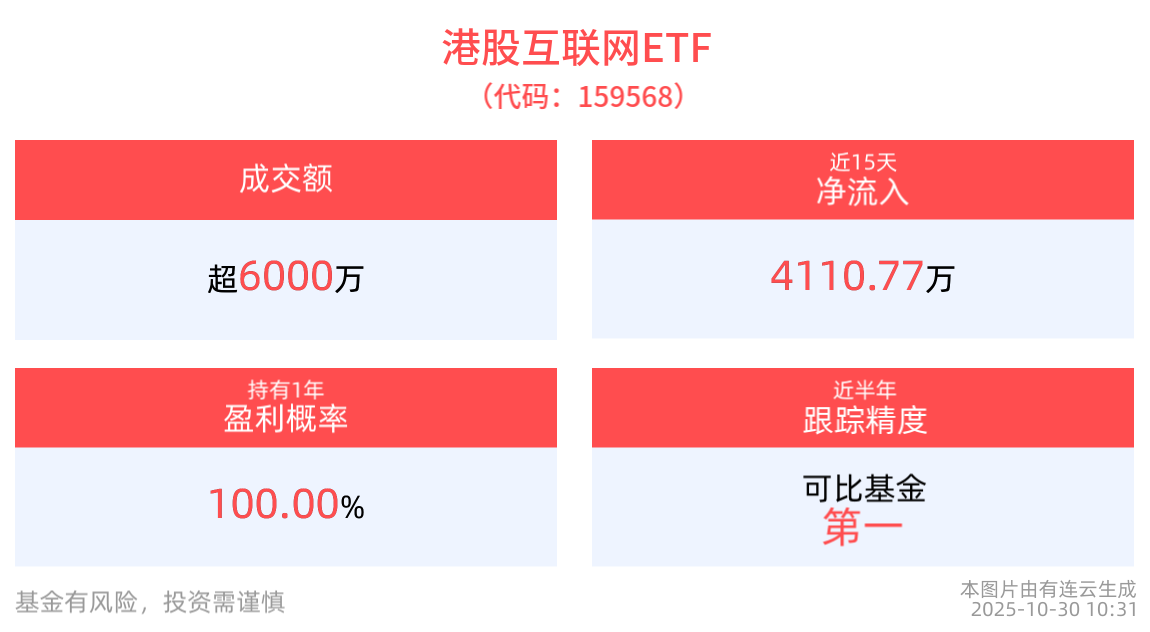 流动性方面,港股互联网ETF盘中换手15.58%,成交6100.81万元,市场交投活跃。拉长时间看,截至10月29日,港股互联网ETF近1年日均成交2.18亿元。