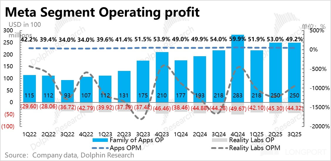 海豚君这里提醒一下,由于明年 AI FOMO 心态持续下,AI 投入过高。这种情况下,Reality Labs 业务可能会成为降本裁员、缩减支出、诺腾到 AI 领域的 “重灾区”。这个操作的过程,就是主营 APP 利润率持续下滑,同时 Reality Labs 亏损持续收窄的趋势。