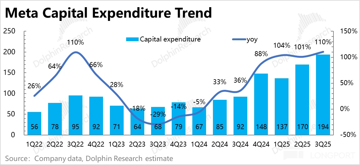 三季度资本开支达 194 亿,Blackwell 拉货上量后,Meta Capex 环比上季度又提升了 24 亿,而按照指引,下季度开支已经应该会拉到 210 亿上下。