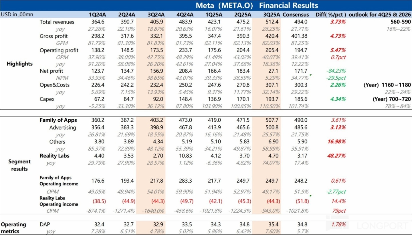 $Meta(META.US) 于美东时间 10 月 30 日盘后发布了 2025 年第三季财报。虽然 27 亿的 “惊悚” 净利润是 “噪音”,但这业绩,尤其是收支指引组合背后隐含的趋势,绝对不是什么值得庆贺的好事。