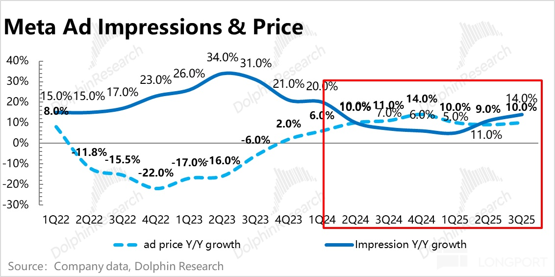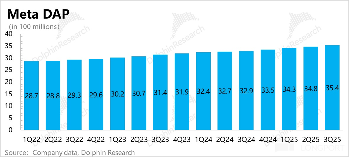 一方面来源于用户盘子还在扩大,DAP(Meta 集团 APP 全家桶的 DAU)同比进一步加速增长到 7.6%;另一方面,从最近几个季度趋势来看,应该还是 Reel 广告变现加速渗透中。海豚君测算下来三季度平均单个用户展示量同比增长 5%,尤其是这个增长是在广告单价持续上升下实现的。