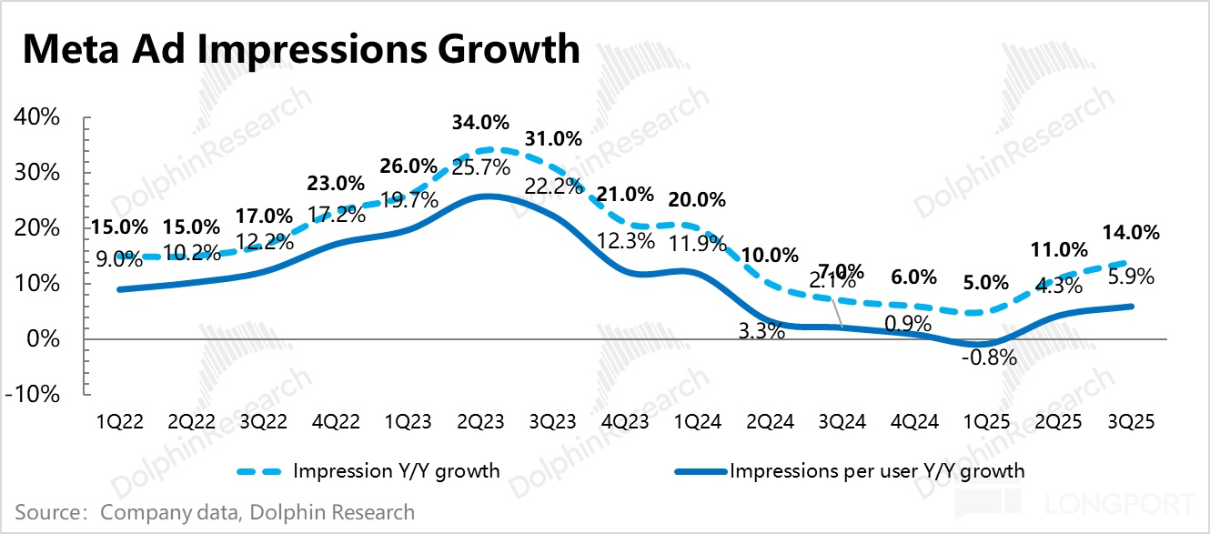 但当下已经则是比较少见的广告和单用户广告展示量双升期。因此海豚君判断,应该主要是 Meta Reels 短视频消费时长上量之后,短视频广告填充率天然较高导致集团平均数结构性拉高。