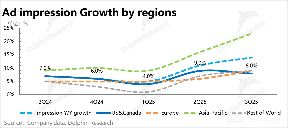 DAP 增长 + 单 DAP 广告展示量增长,带动三季度总展示量增长了 14%,表现相当不错。而分地区的总展示量,还是能明显看到 Meta 作为广告平台的广告释放闸门控制力: