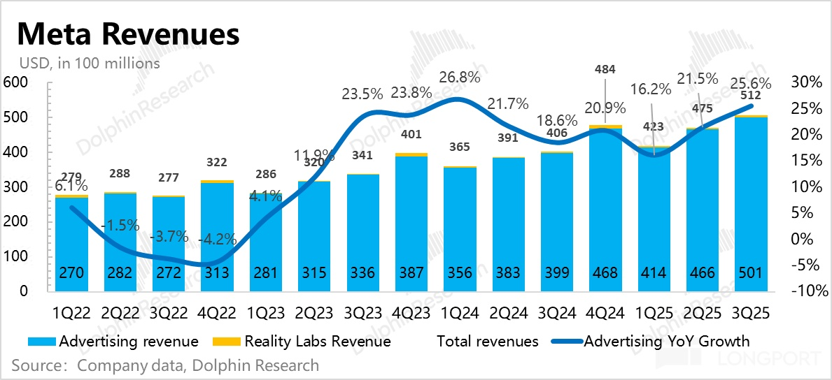 三季度 Meta 营收 512 亿,同比加速增长到 26%,超出指引上限,但由于市场已提前预期了三季度收入的增长(三方跟踪平台数据显示广告核心指标三季度广告展示量加速增长到 15%),并不算非常超预期。