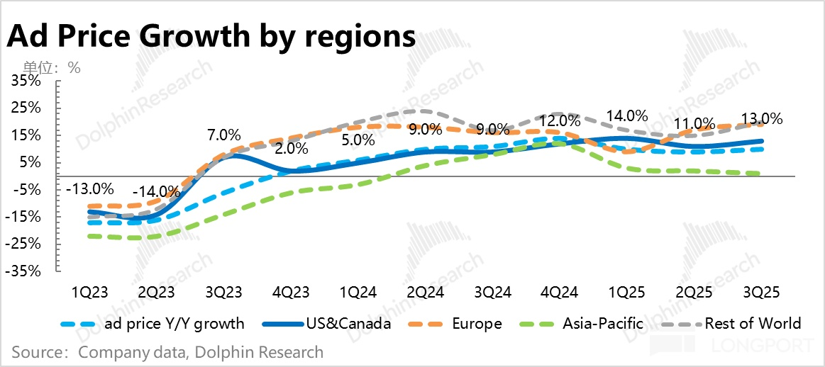 三季度综合广告单价的同比加速了一个百分点,到 10%。分区上很明显,欧洲因汇率顺风,同比增速迅速进一步拉到 19%,而且美国本土广告单价也进一步增长到了 13%。