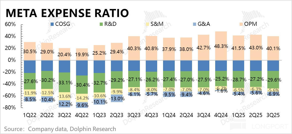 由于广告收入在 Meta 中占到了 98% 的权重,这个收入的增长指引基于等同于广告增长,换句话说四季度增长要放缓。考虑到 Meta 每次都会超出指引的最高端,但即使四季度 Meta 收入最终如买方最高预期,落袋 600 亿,同比增长也就 24%,仍然是一个增长放缓的趋势。